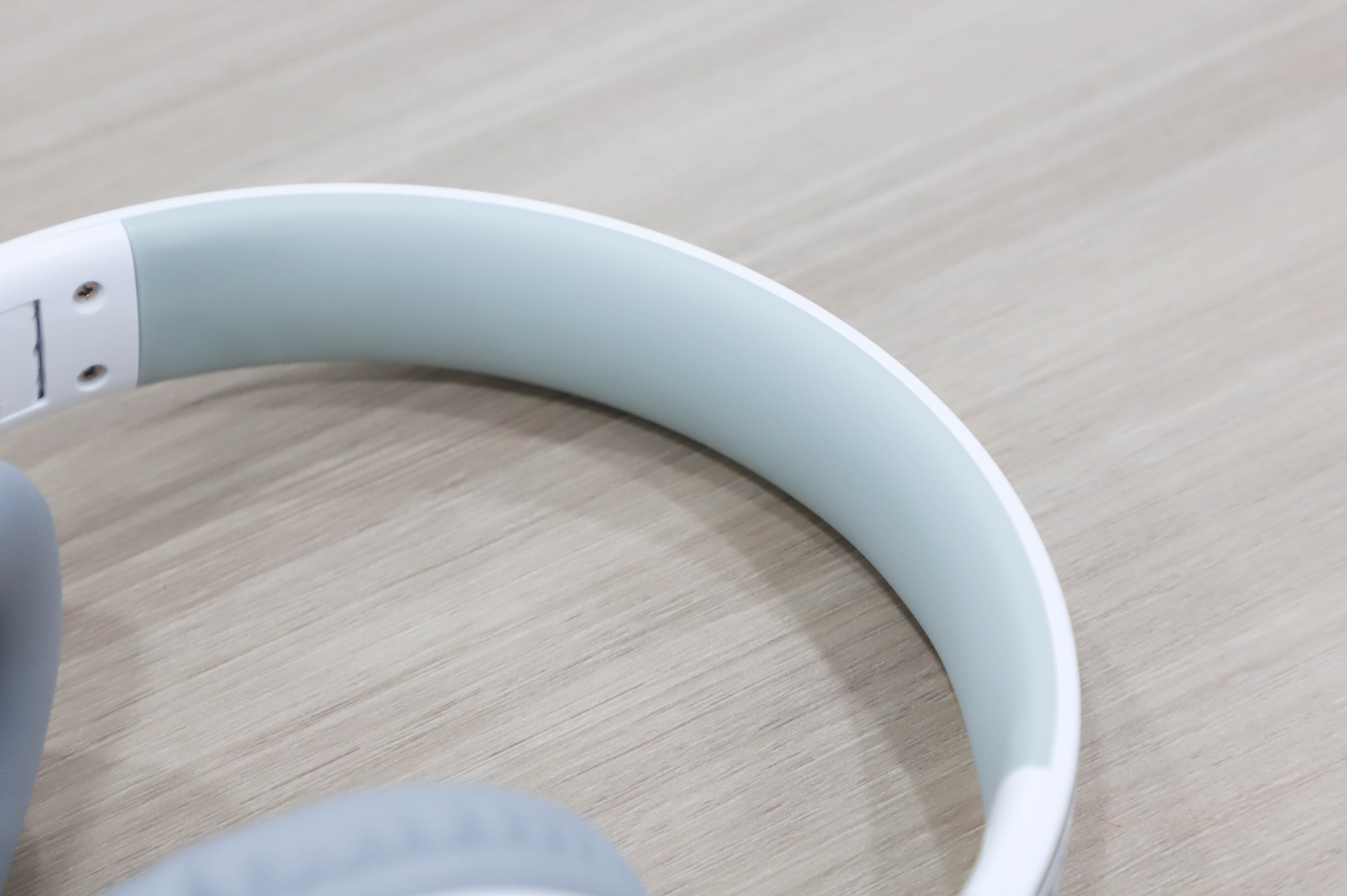 耳机头粱外壳为硬塑料材质,类肤质手感,在靠近头顶的一侧覆盖了软胶材质,提升佩戴舒适度。