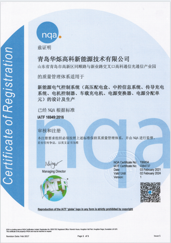 青岛华烁高科先后通过了ISO9001质量管理体系认证、ISO14001环境管理体系认证、ISO45001职业健康安全管理体系认证、IATF16949管理体系认证等,严格实施科学、严谨、规范的产品开发、生产和品质管理、市场服务体系,确保为市场客户提供最优质产品。