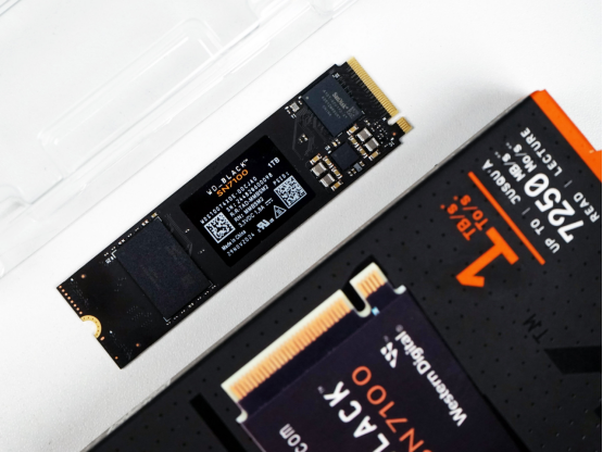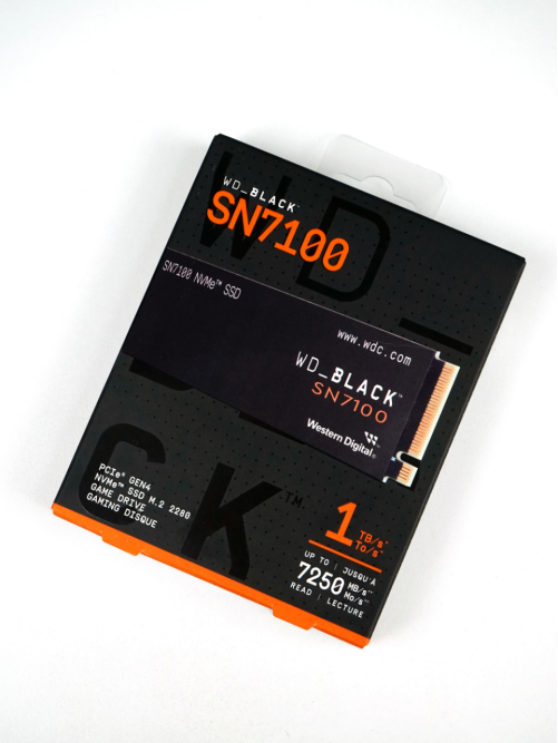 WD_BLACK SN7100的包装,延续了系列一贯的黑橙配色风格,第一眼就可以看到左上角显眼的SN7100型号,右下角7250MB/s的速度标识,也直观的让大家了解到它的性能上限。