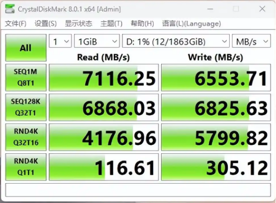 而Q1T1的随机4K读取和写入速度是喜人的,SN7100的随机4K竟然能来到116MB/s的水平,处于第一梯队,要知道随机性能是决定游戏等应用开启速度的关键。