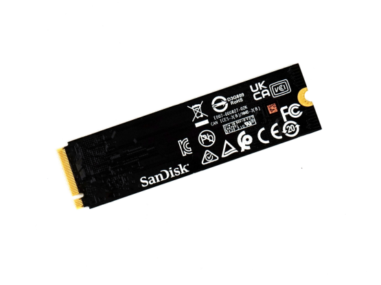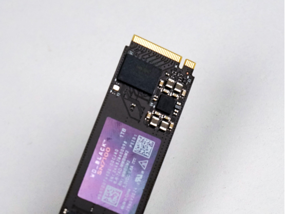 SN7100的PCB板上可以明显看到闪存芯片仅有 1 颗,颗粒型号为 022644 1T00,单颗容量 1TB,是 SanDisk 闪迪原厂最新一代 3D NAND TLC 闪存颗粒。此外主控芯片上面型号是SanDisk A101-000172-A1,是闪迪最新一代DRAM-less SSD主控芯片, PCIe Gen4接口,支持HMB技术和智能SLC缓存技术。