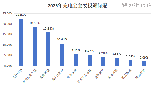 根据消费保平台统计,2025年充电宝相关投诉已达到2556件;用户主要投诉问题集中在退款纠纷,售后服务欠缺和质量问题。