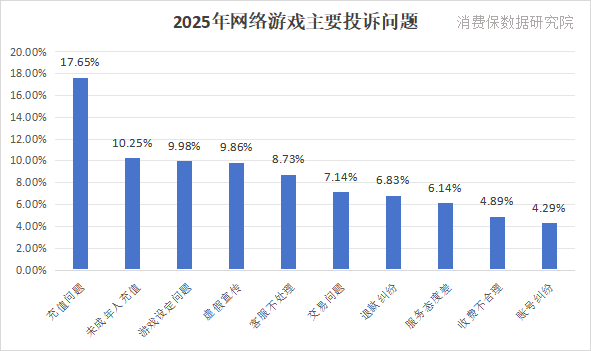 根据消费保平台统计,2025年网络游戏相关投诉达到63684件,7月与12月投诉量破万,用户主要投诉问题集中充值问题、未成年人充值、游戏设定问题。