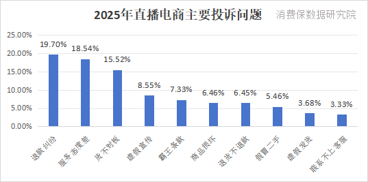 直播电商在持续渗透并重塑大众消费习惯的同时,行业整体进入规范成本上升、模式创新与风险积累并存的关键调整期。根据消费保平台统计,2025年直播电商相关投诉达到16.97万件,全年投诉量持续上升,共有11个月份投诉量破万,用户主要投诉问题集中在退款纠纷、服务态度差、货不对板。