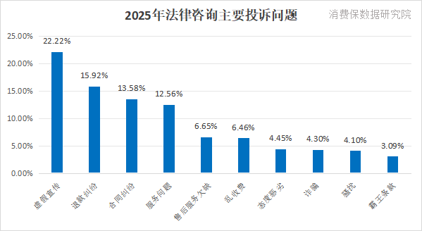 根据消费保平台统计,2025年法律咨询相关投诉达到4015件,全年投诉量整体呈上升趋势;虚假宣传、退款纠纷和合同纠纷成为投诉重灾区。